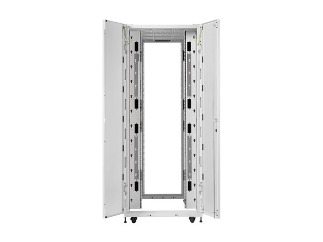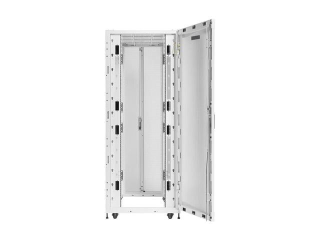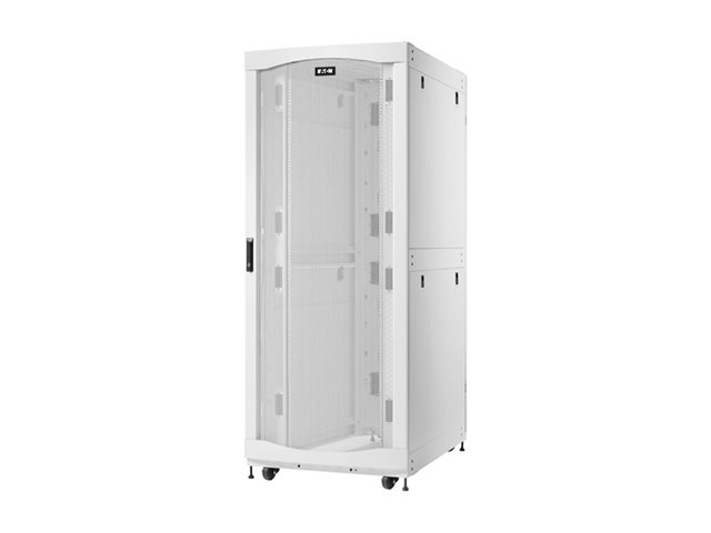 Eaton SmartRack 45U standarddybde ekstra bredt rackkabinet til tungt udstyr er designet til at imødekomme behovene hos AI-servere. Det ekstra brede design giver plads til effektiv udstyrsstyring, mens den robuste stålkonstruktion sikrer holdbarhed i forskellige miljøer. Hvert kabinet har funktioner såsom tunge, aflåselige sidepaneler, nivelleringsben for stabilitet og hjul for mobilitet. Dette rackkabinet overholder flere standarder og tilbyder pålidelighed til kritiske serverapplikationer.