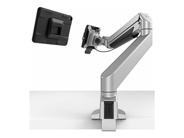 Allows data and power transfer through USB-C interface, locking mechanism for tablet security, "lift to release" mechanism, integrated kickstand on tablet side, extending flexible arm and cable-free charging.