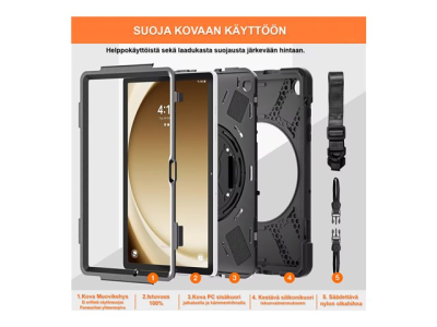The case is like a shell; it protects the cover as well as sides and corners of the Tab. Raised lip protects screen of your Tab. The phone can be freely used without fear of damage, shocks and bumps. With Rugged Armor on, the Tab will gain full protection against scratches and a military appearance. The case has all necessary cutouts which provides an easy access to all buttons, controls and ports. The power and volume buttons are completely covered with rubber but it does not interfere with their functions. Camera, flash, headphones, speaker and charger holes guarantee the full functionality of the phone. Thanks to an integrated stand on the back panel it has never been easier to surf on the Internet and watch movies.