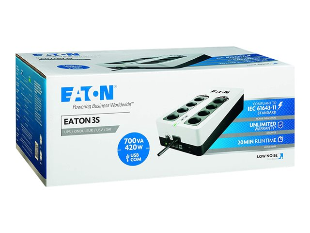 - Eaton 3S leverer batteribackup under strømafbrydelse og avanceret overspændingsbeskyttelse for at forhindre skader fra lynnedslag eller utilsigtet overspænding på nettet