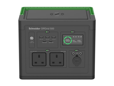 Schneider OffGrid 500 - Transportabel strømstation - LCD, 2 BS1363 stik, sinuskurve, 3 USB-A, 2 USB-C, trådløs oplader - AC 195 - 265 / DC 12 -30 V - 500 Watt - Litiumion - 517 Wh - output-stikforbindelser: 2 - United Kingdom - sort, grøn